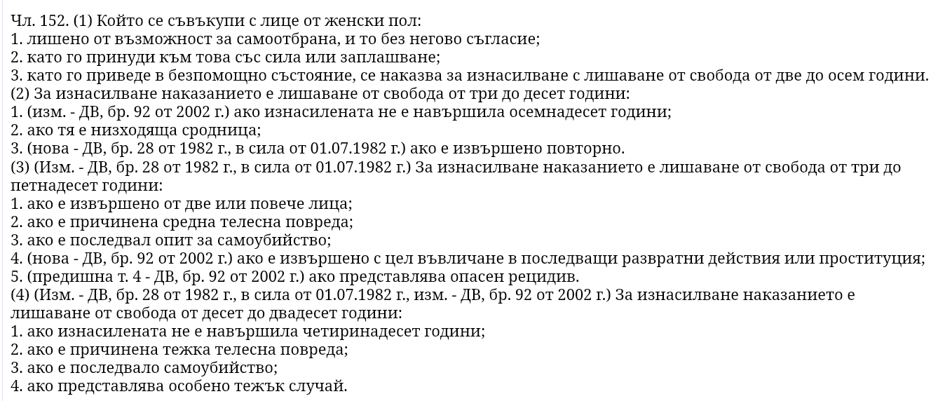 Аз не знам при какви обстоятелства съдът приема, че има изнасилване - при изрично изявено несъгласие или при липса на съгласие. Ще кажете, че е едно и също. Не е. Изрично изявеното несъгласие означава, че жертвата трябва ясно да е казала "не" или "спри" или нещо подобно, а липсата на "не" означава, че сексът е доброволен. При изричното даване на съгласие обаче и двамата души трябва да са казали, че са съгласни или да се подразбира, че е имало съгласие. При първата хипотеза упоените и изпадналите в безсъзнание не са изнасилени, при втората - такъв сексуален контакт вече влиза в графата "сексуално насилие". Отделно че за изнасилване се счита само вагиналното проникване, но не и аналното или оралното, камо ли пък изнасилването с пръсти (fingering). И още, и още... Аз не съм юрист, но дори аз виждам "пробойните" в законодателството, какво остава за правистите?
