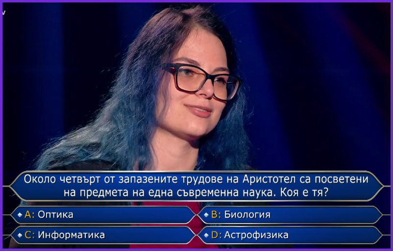 Който се притеснява, не се записва в предаването, това не го ли осъзнават. Притеснение винаги ще има, но трябва да го превъзможнеш, колкото по-рано е възможно, иначе си указва негативно влияние. За Иска, някак си така си щракваше възможния отговор, без грам да вложи мисъл. Признавам си за въпроса, кой се хранил с насекоми и аз не знаех, кой е правилния отговор, но знам, че Мечо Пух и Храбрия шивач не са. Другите 2 отговора, не съм ги чел/гледал, но остава човек и костенурка. За седалките в киното, преди да излезнат възможните отговори си бях за червения цвят, ако не знаех бих го свързал със завесата, червения килим и т.н. Всички цветове имат някаква символика, даже да се тръгне в тази посока пак може да се стигне до правилния отговор. И последния въпрос за 10 -те божи заповеди на какво са били написани. Папируса си е харектерно за Египет и фараоните там, бронза си идва някакво съвременно за времето тогава и остават камък и глина. Ако се вложи и тук мисъл щом е заповед, трябва да е нещо здраво, което да се пази и дълго време. Не случайно надгробните плочи едно време са се дялали от камък, а не от глина. Глината лесно се обработва, но не е трайна.