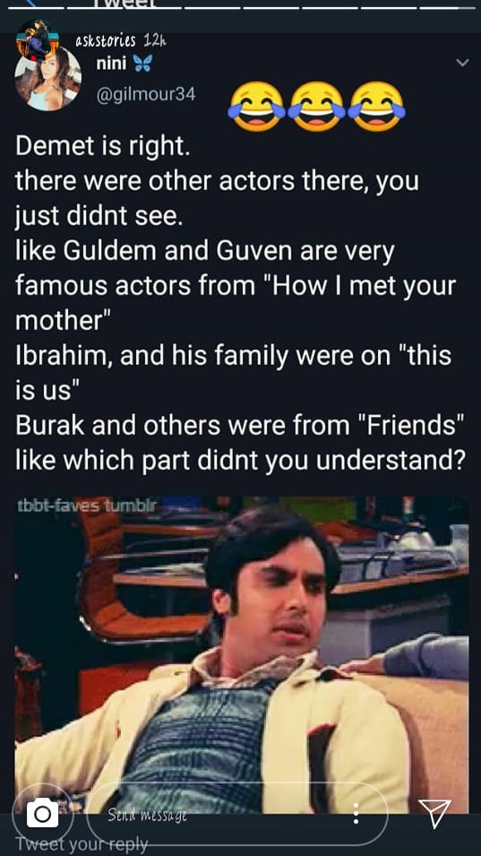 "Демет беше права. Наистина на партито е имало и други актьори, но не сте ги видели. Като  Гюлдем и Гювен, които са много известни  актьори от сериала "Как се запознах с майка ви", Ибрахим и семейството му от "Това сме ние", Бурак и другите от "Приятели", така че коя част точно от изказването е неясна ..."  Stuck Out Tongue