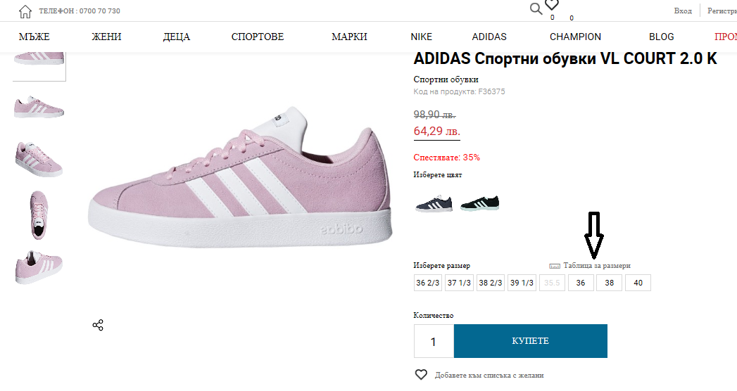 Като изберете желания модел, над полето с размерите има таблица с размерите.