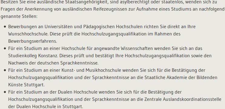 За да може да ви се помогне  адекватно, е най-добре да кажете с каква диплома кандидатствате и в какво учебно заведение. Попринцип дипломите от нормалните български гимназии се признават без да минават специална проверка през министерството на бундеслендера. За медицина тази проверка се поема от hochschulstart, а за почти всички останали от uniassist. Освен това в сайта се казва, че при чуждестранна диплома за средно образование признаването става директно през университета, обаче случаите с Fachhoschschule и Duale Hochschule BW са малко особени.