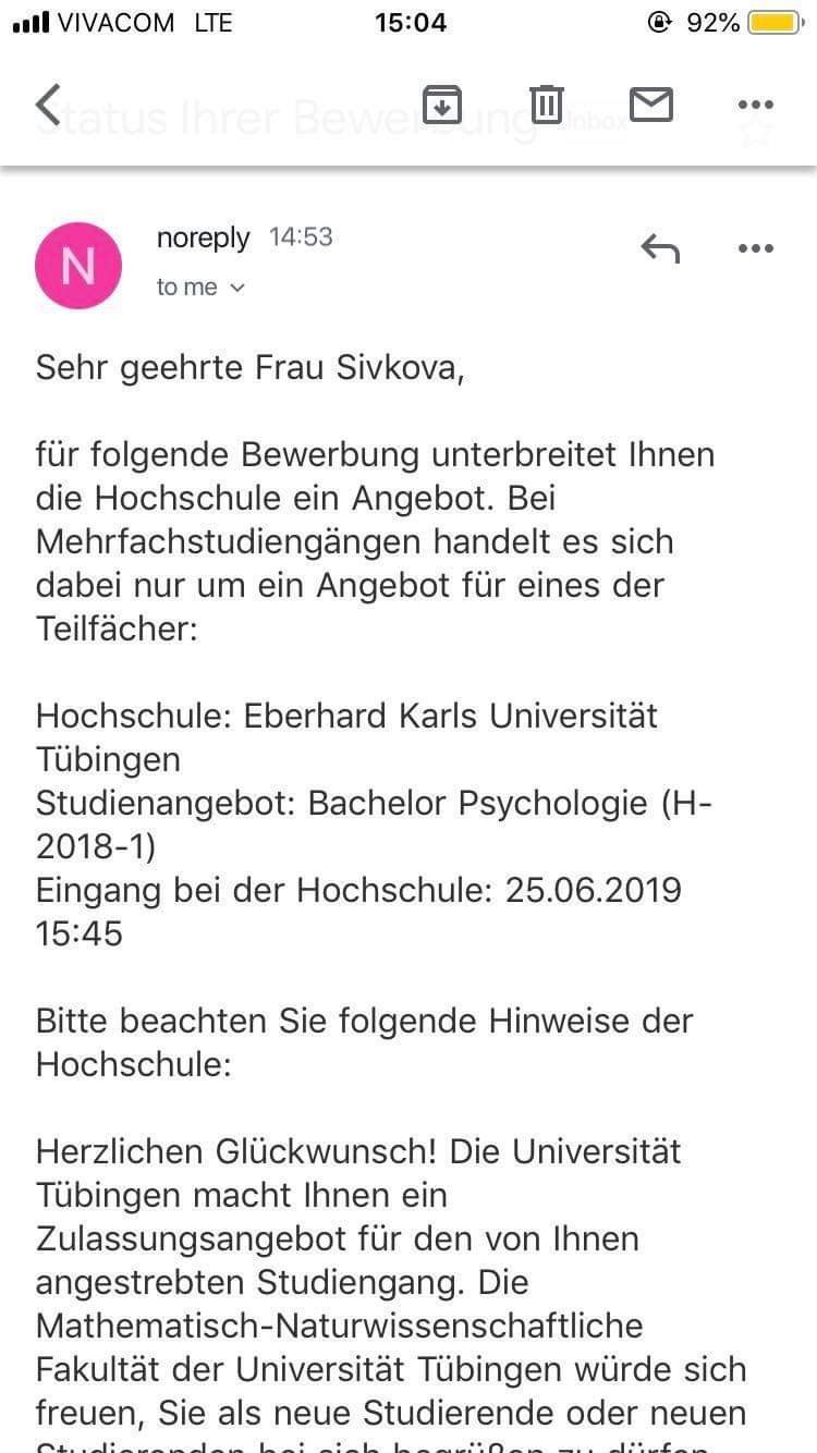 Усетих се и й пуснах и там линка.  Simple Smile Влязох специално и на сайта на Уни Тюбинген за психология, бакалавър. Видях го това искане, но то е  като добавка (ако се налага) към дипломата за средно образование. Да не би средното да е от професионална гимназия, а не примерно от ЕГ, та да се налага приравняване? Понеже оставам с впечатлението, че не е общовалидно изискване.