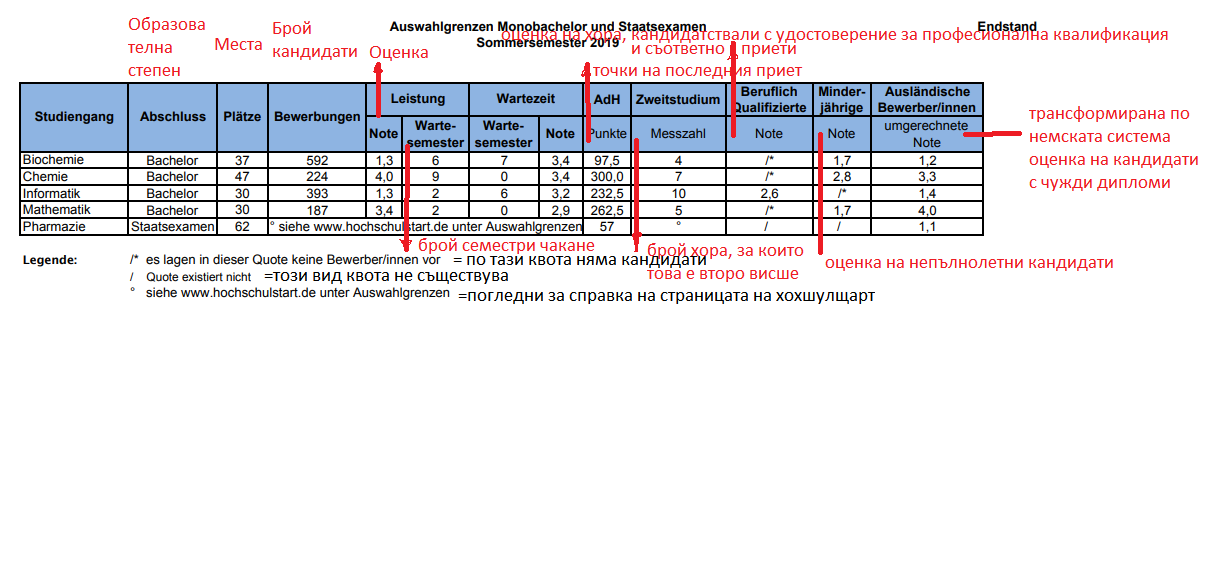 В таблицата "Auswahlgrenzen Monobachelor und Staatsexamen Wintersemester 2018/2019"