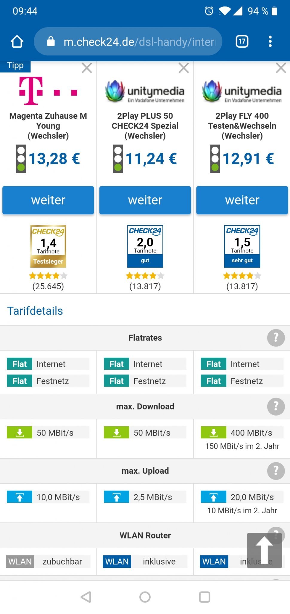 От първите три (пуснах сравнение), тази unitymedia, което било vodafone, ми изглежда най-добре, като най-добър Preis-Leistung е третото, заради по-високите скорости и разликата от 1,50 евро месечно.