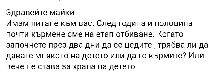 Казвам ѝ, че кърмя, подкрепям кърменето и каката съм я кърмила година и половина. А тя така се ококори срещу мен и рече : ооо, браво, браво. И аз много исках да ги кърмя моите, ама нямах кърма. Много исках иначе.