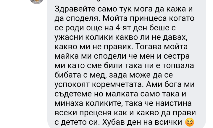 Като се сетя как за малко беше тази тъпачка да съм и аз! Бабата диагностицира детето с колики още веднага след като се върнахме от болницата. Добре, че дойде консултантката по кърмене. Тя каза, че храня детето твърде много и от това го боли коремчето. Въпреки, че на новородено не се слага режим тя ни постави такъв за няколко дена - не повече от 11 пъти кърмене за денонощие и не повече от половин час на едно кърмене, като правиш масаж, за да не заспива докато суче. За няма и два дни минаха "коликите" .