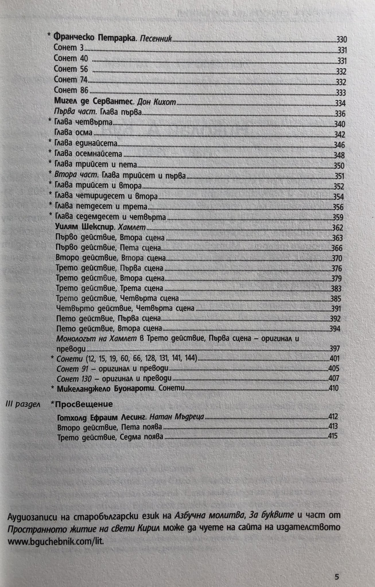 • представя отделни творби в оригинал и чрез преводи, което способства за развитието на езиковите компетентности на учениците.