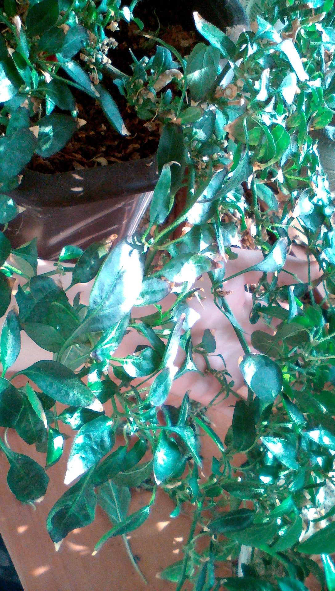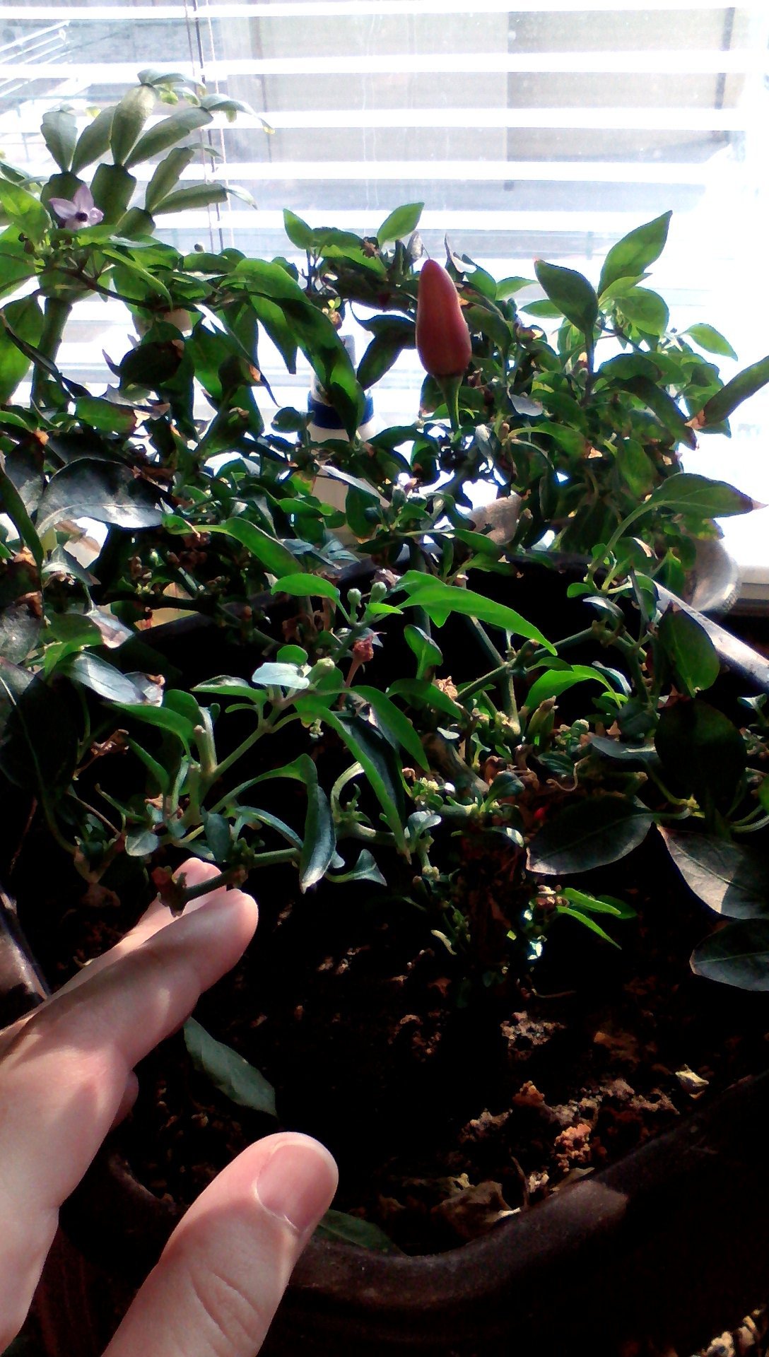 Ето я моята чушка, но е между други саксии и ми е трудно да я завъртя, за да снимам хубаво. Тя расте нашироко - на втората снимка се вижда как е порасла настрани (по-широка от педя - ръката ми е отдолу, но не се вижда ясно, защото телефонът ми прави скапани снимки):
