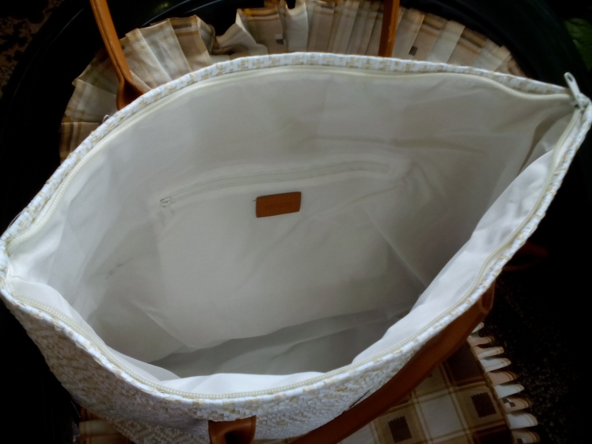 Ами не я виждам в брошурата, ама беше пускана с банските или малко след това. Светлобежова, на ромбчета с кафяви дръжки имитиращи кожа. Била е на близо 17лв, купих я на 12 с намалението, с хастар, цип, вътрешен джоб с ципче. После, ако мога ще снимам и кача. Бе хубава е за парите и удобна