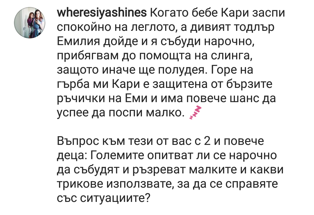 Преди няколко страници писахте за @wheresiyashines. Следя я в Иг, но само там и то от скоро. Не бях ѝ гледала старите постове и не знаех, че е раждала вкъщи и то пред детето си. Разбрах от Вас тук. Днес реших да потърся и да видя за какво става въпрос. В блогът ѝ намерих подробни обяснения. Честно казано съм изумена и не разбирам каква е идеята да родиш пред детето си? Тя се чуди (на такива хора като мен) и не вижда причина, то да не присъства на раждането на своя брат/сестра. Питам тогава аз: Ами защо тогава да не присъства и на правенето на бебето? Мисля, че пак ще му е интересно. Извинявам се, ако звуча грубо, но наистина съм потресена и в крайна сметка пак е стигнала до болницата. Пълна тъпотия! Sorry not sorry!
