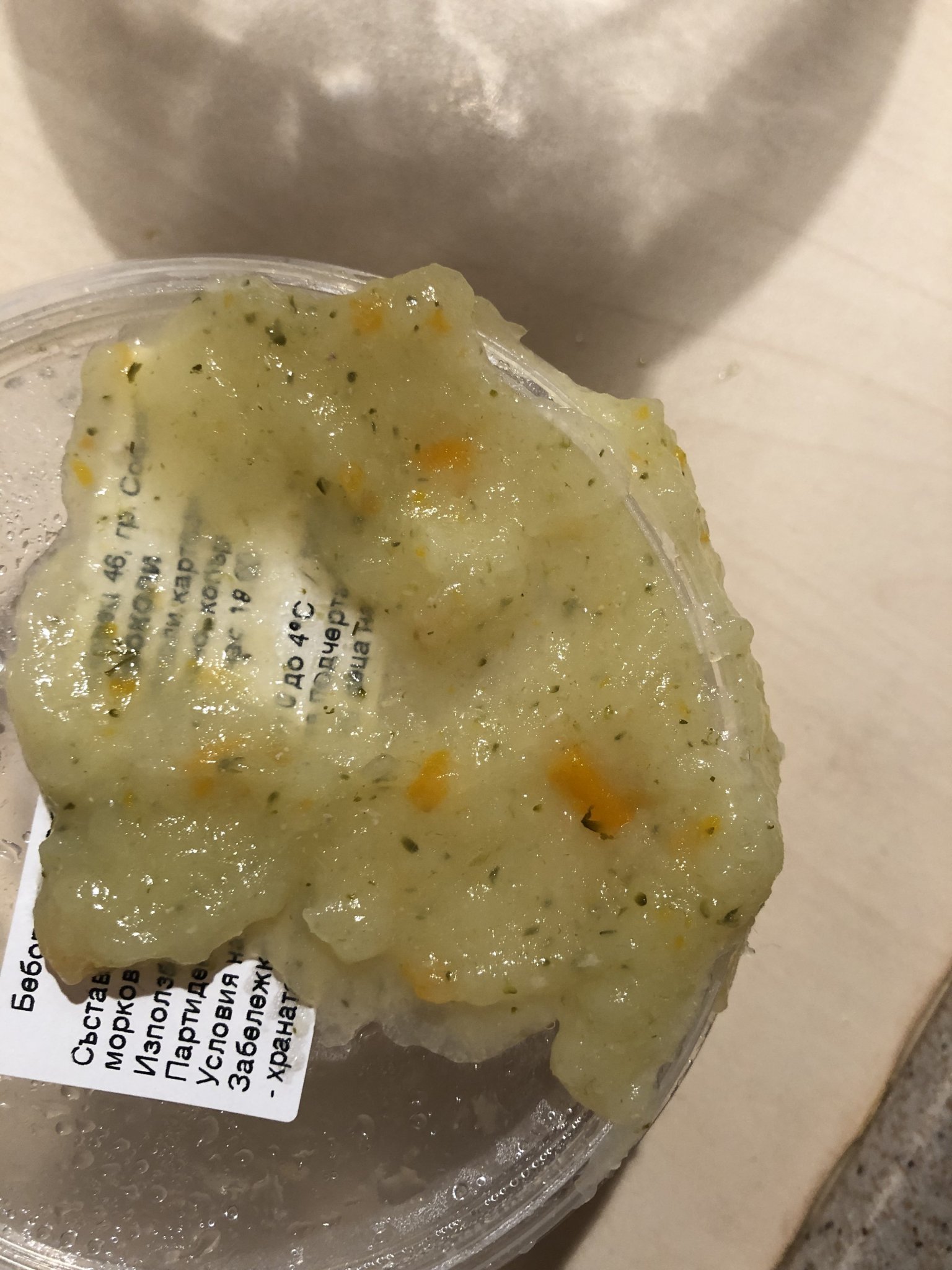 Sollsoll, ето снимка на пюрето от четвъртък - заешко с броколи. Беше прозрачно. И да е имало заешко, въобще не се виждаше и усещаше. Хвърлих го и дадох домашно. Аз й готвя по принцип, но реших да пробвам кухня.