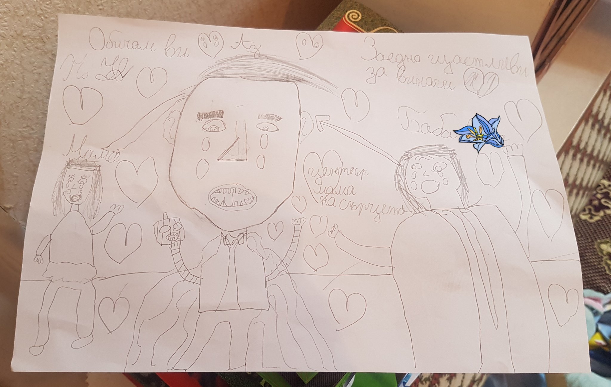 Нарисуваното в ръката на детето да не би да е маска с усмивка ? Или не довиждам нещо ...