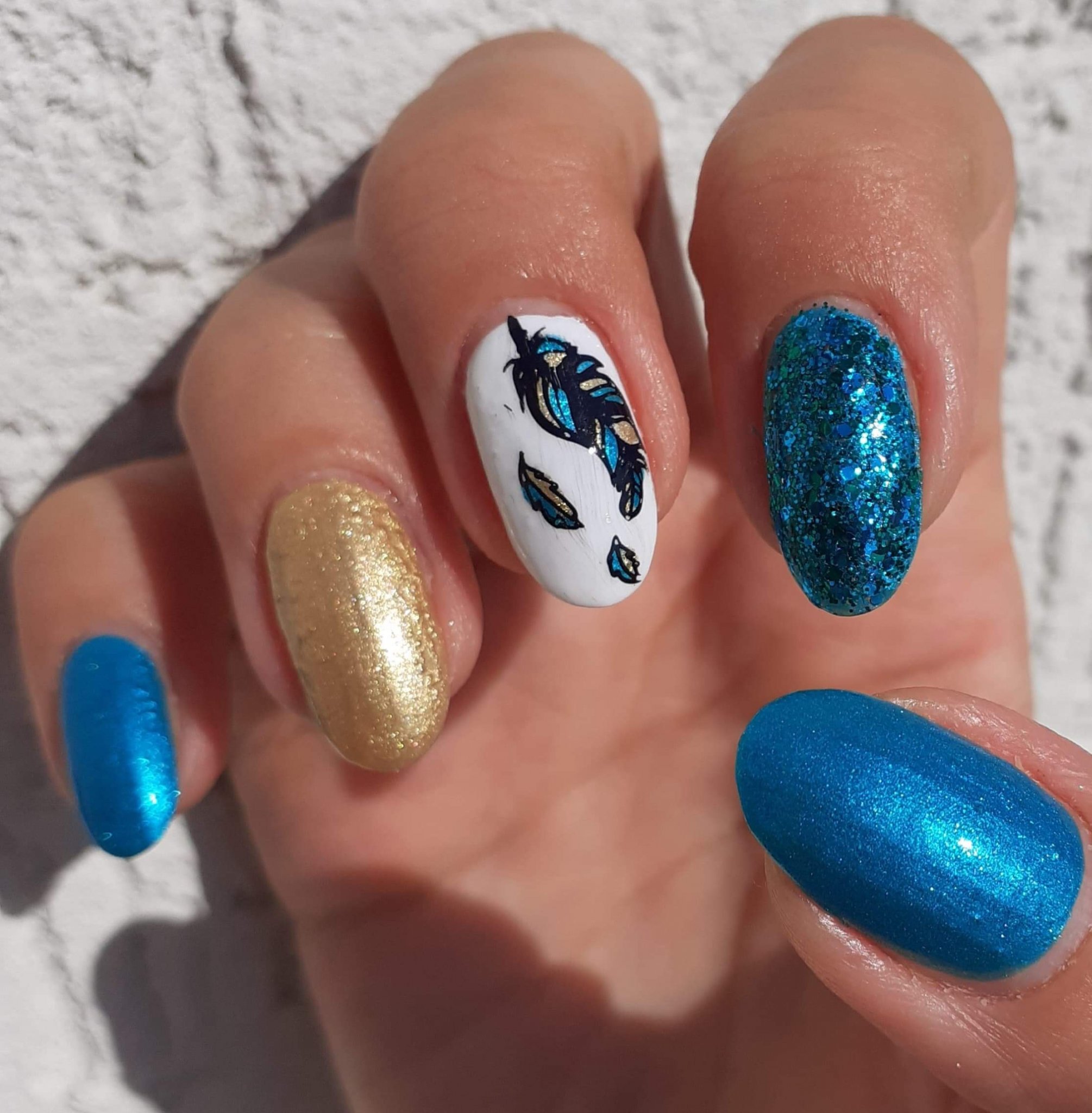 Лака е Catherine Arley 08, а броката Essence colour & go - 78 blue addicted /от старите шишенца/. Декорацията е ваденка.