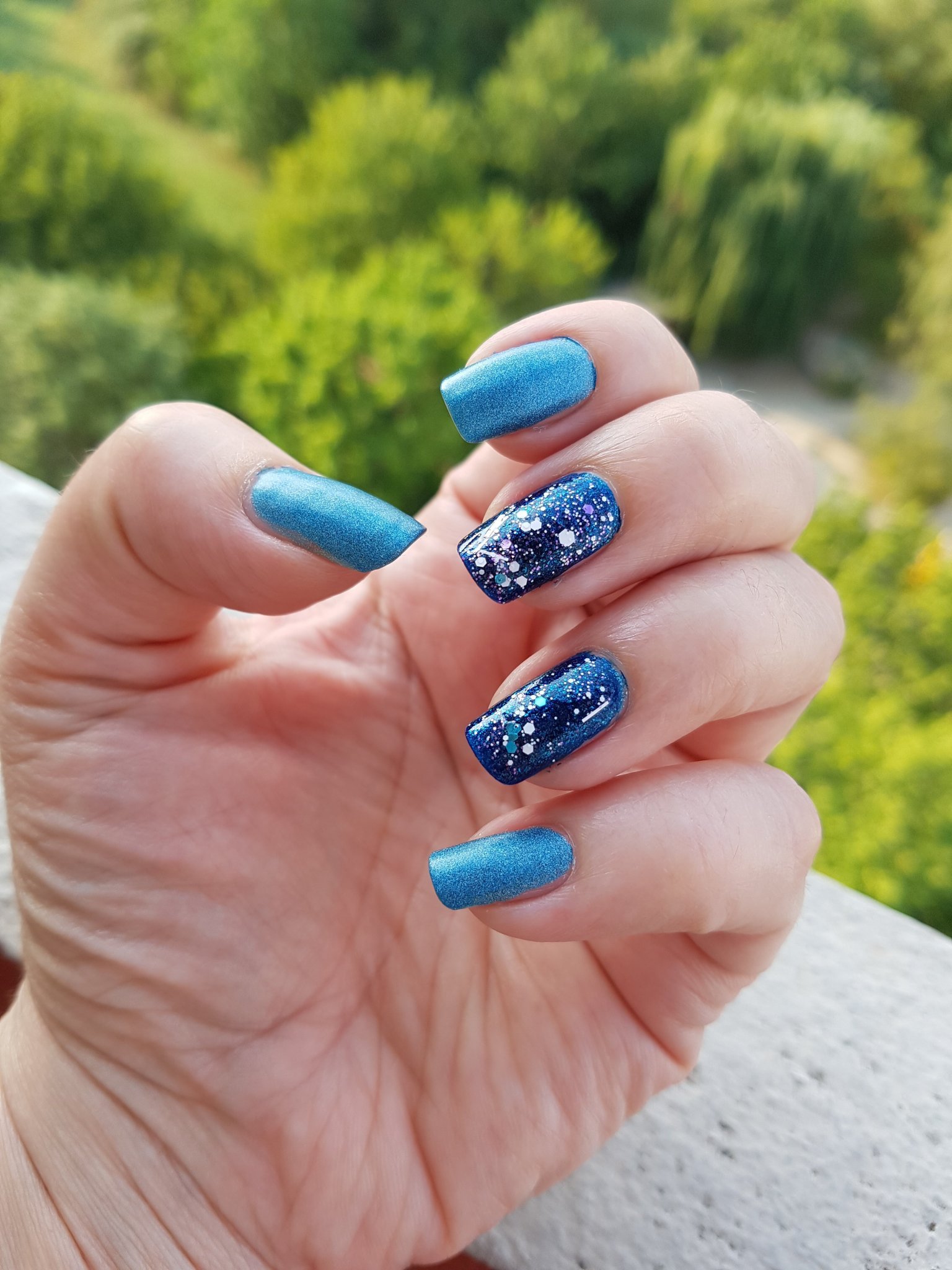 Синьо зелени са брокатчетата, да. Не съм в къщи да видя номера. Не съм кой знае колко очарована на първо четене от него специално.