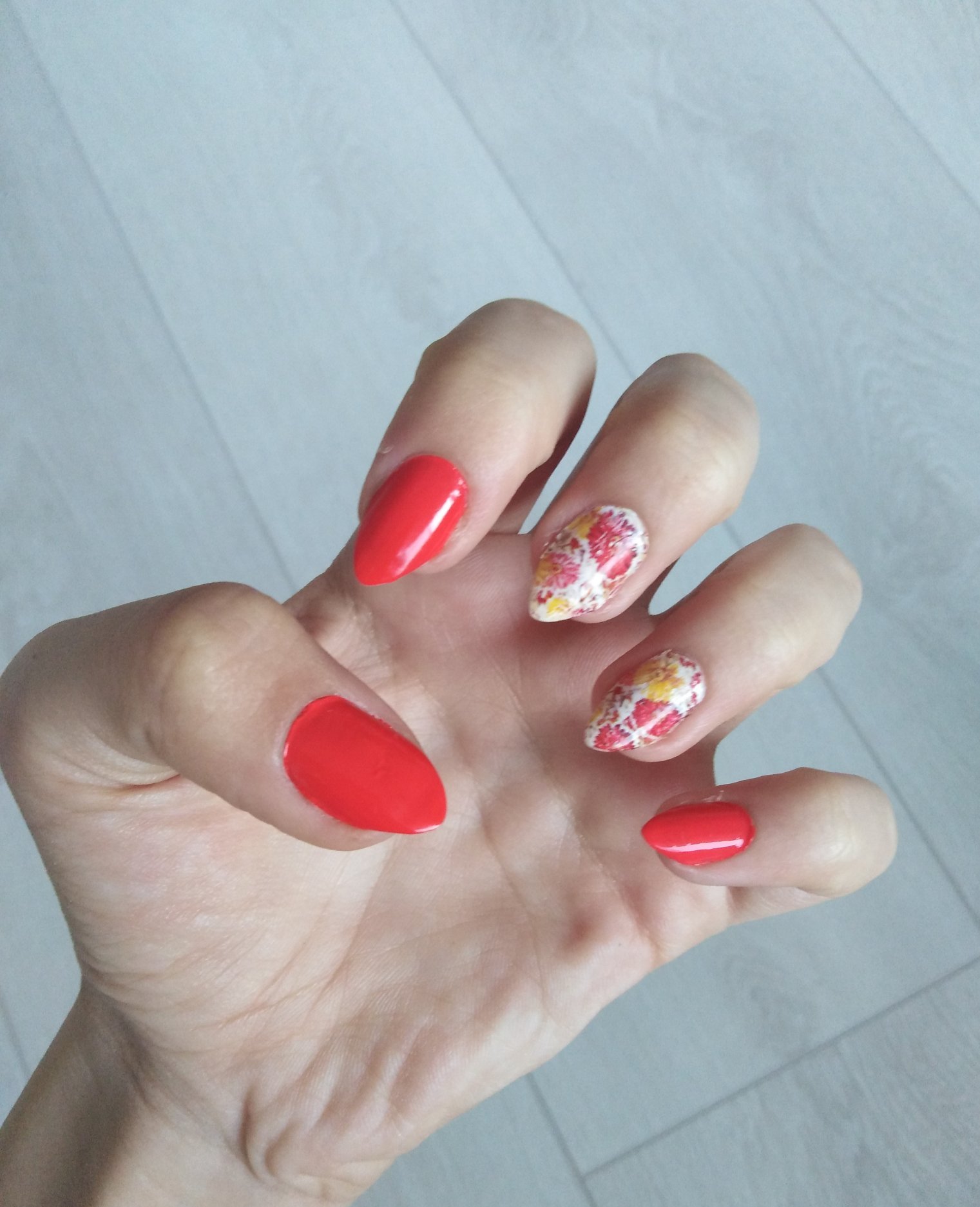 Лакът е на Perfect. Нещо между коралово и червено, май цяло лято не бях слагала такъв цвят. Стикерите са доста стари и ми се стори, че като сложих топа леко избледняха.