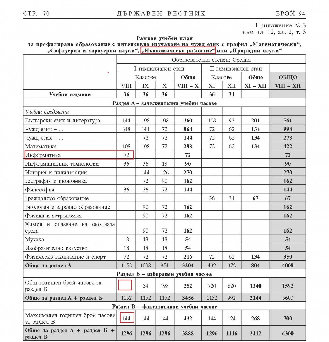Този учебен план е за друг профил. Икономическо развитие  с ИИЧЕ имат информатика в осми клас и няма предвидени часове за раздел Б ( ИУЧ). Евентуално може да сложат ФУЧ ГИ.