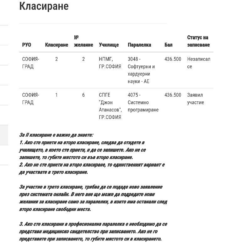 Е,доживяхме! При нас има резултата и от първо класиране ,под него от второ.Минахме напред,но не до мечтания език.Ще следим свободни места и на 3-то и на финала.Продължаваме с АЕ и нов - ИЕ.Дано и той го одобри.Yum