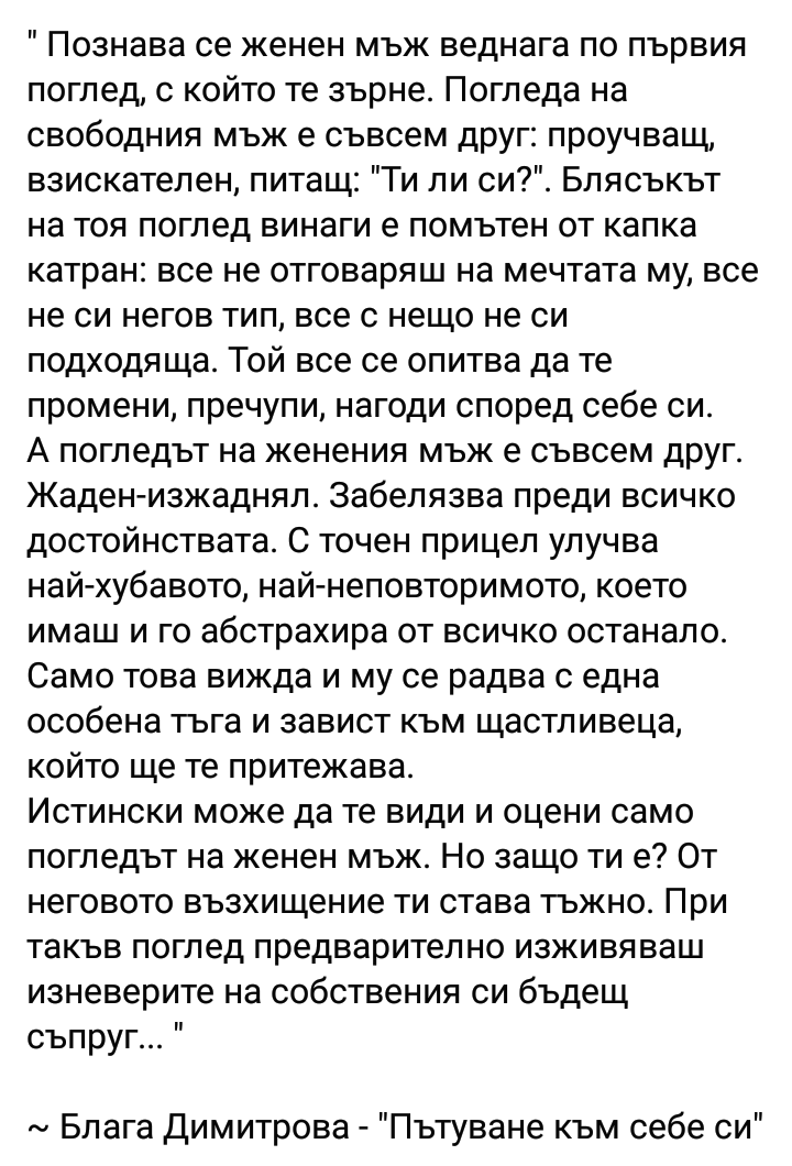 „В живота има много повече от това, което се вижда на пръв поглед. Има слоеве и слоеве от значение и смисъл, които чакат да бъдат открити. Като държим очите си отворени и сърцата си готови да научим, можем да се докоснем до истинската същност на съществуването.“ – Йосиф Бродски „Човек не може да живее само с хляб. Има нужда от рози, романтика, изкуство, музика... от нещо, което кара живота му да изглежда по-красив.“ – Одри Хепбърн „Прозата е архитектура, а не интериорна декорация. Тя е издигане на структура от думи върху основата на смисъла.“ – Ърнест Хемингуей „Истинската любов не се основава на това колко добре се познаваме един друг, а по-скоро колко добре можем да обичаме и да бъдем обичани.“ – Сет Годин „Да четеш книги е като да отваряш врати към стаи, които никога преди не си виждал. Всяка книга е нова стая, пълна с нови идеи и знания.“ – Мерри Шели „Добротата в малко количество може да доведе до зло в голямо количество.“ – Ърнест Хемингуей „Животът е кратък, изкуството е дълговечно. Животът без изкуство е грешка, а изкуството без живот е нищо.“ – Ошо „Смехът е най-краткото разстояние между двама души.“ – Виктор Юго „Щастието не може да бъде намерено в края на дъгата, защото по дефиниция дъгите винаги са в процес на движение. Щастието се намира точно тук и сега, във всеки момент от живота ни.“ – Нийл ДеГрас Тайсън „Свободата е способността да правиш това, което трябва да направиш.“ – Ралф Уолдо Емерсън „Животът е кратък. Изживейте го пълноценно. Прегърнете промяната. Ценете любовта и връзките, които имате с другите. И никога не спирайте да учите и да растете.“ – неизвестен автор „В живота няма грешки, има само уроци.“ – неизвестен автор „Миналото не може да бъде променено, бъдещето е несигурно, така че съсредоточете се върху настоящето.“ – неизвестен автор „Най-голямата радост в живота е да се раздаваш безкористно и без очакване за награда.“ – неизвестен автор „Истинското щастие идва отвътре. То не зависи от външни обстоятелства или хора.“ – неизвестен автор „Не позволявайте на страха да ви спре. Страхът е фалшив. Това е просто илюзия, която възниква в ума ви.“ – неизвестен автор „Животът е твърде кратък, за да се събуждаш с горчивина в сърцето си. Избирайте щастието и бъдете благодарни за всеки момент от живота си.“ – неизвестен автор