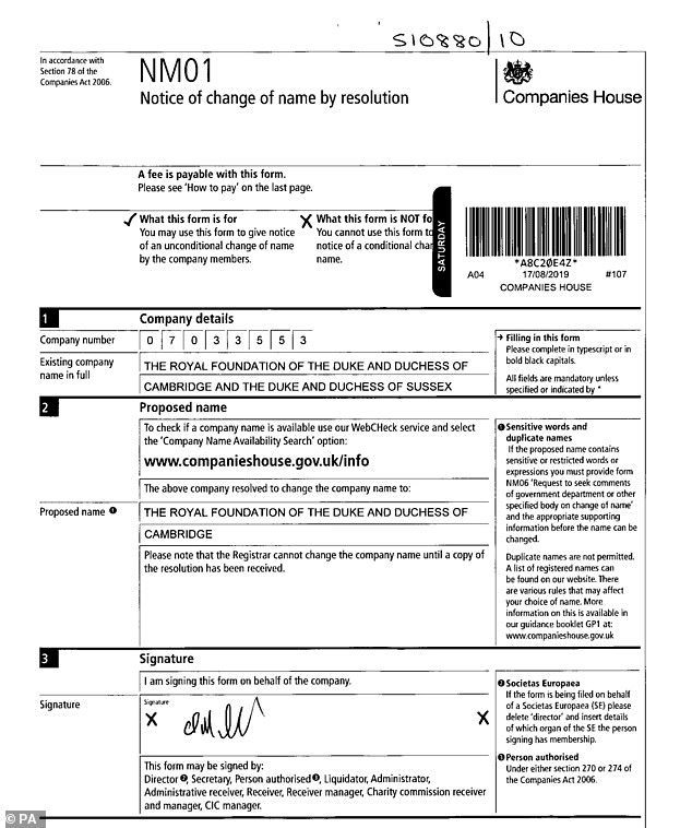 Сега името на фондацията е "'Royal Foundation Of The Duke And Duchess of Cambridge'" / 'Кралска Фондация на Херцога и Херцогинята на Кеймбридж'.