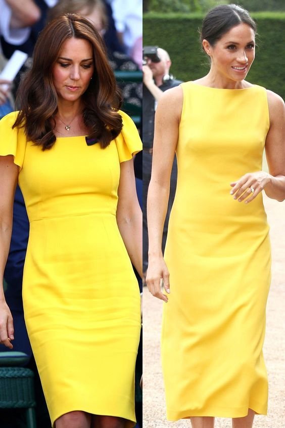Съпоставката с жълтите рокли е в полза на Кейт. Това, че тази на Меган е без ръкави я прави равна от раменете до под колената.