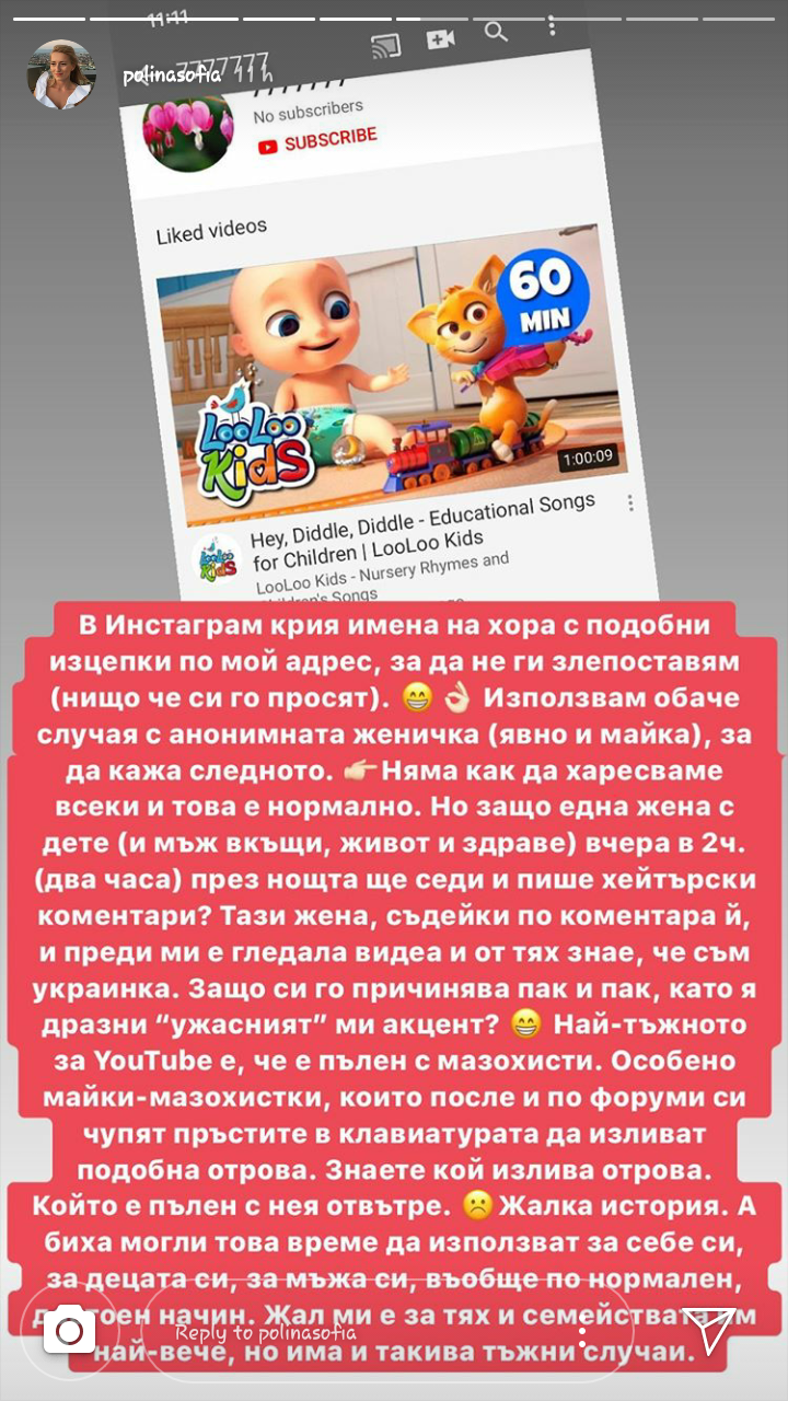 Сторитата на Полина са в отговор на коментар, който е под последното й видео.