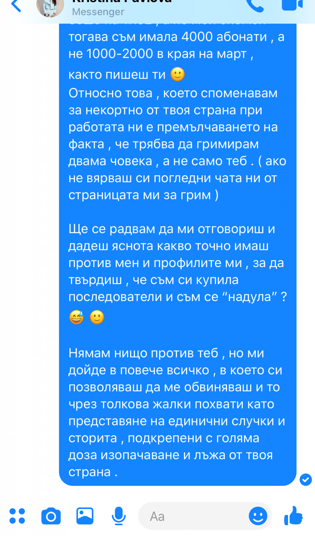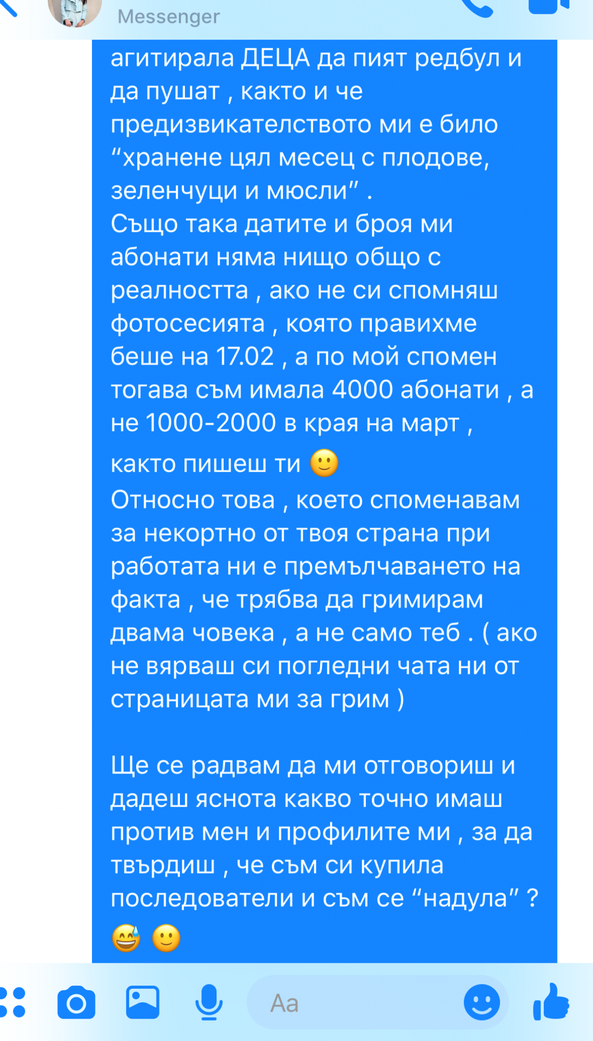 Изказването ти за колаборацията ни е меко казано смешно и отново излъга . Никога не си ме канила на нищо повече , погледни си добре чатовете ни във всички платформи, ако обичаш . Да , получих снимки, това е факт , но некоректното е че ти си спестяваш за колко работа точно става въпрос , нямаше да ти откажа ако беше казала , че сте две , но е въпрос на възпитание , когато се уговаряш да бъдеш прозрачен и честен.