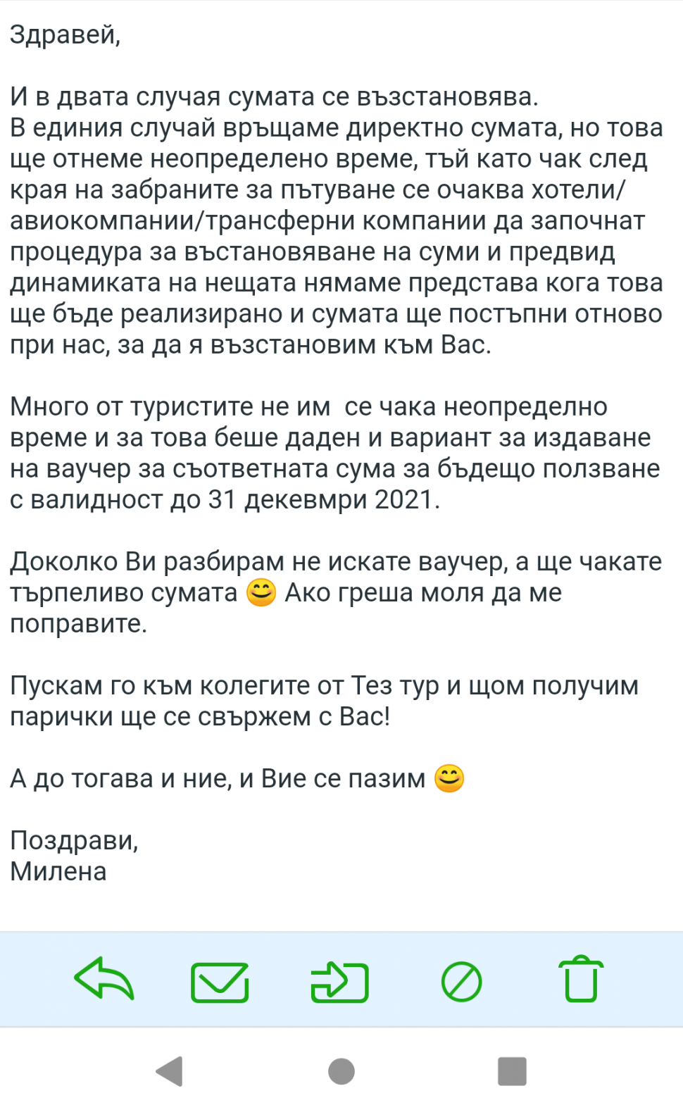 От агенцията посредник, крайният продукт е на Тез Тур, се опитаха да ми предложат ваучер за същата стойност до края на 2021. Казах, че искам връщане на сумата, а после ще си правя нова резервация, когато и да е, тъй като изобщо нямам яснота кога ще мога. Обясниха, че чакането ще е голямо. След прекратяване на извънредното положение ще вземат решение в какъв срок ще се възстановят суми.
