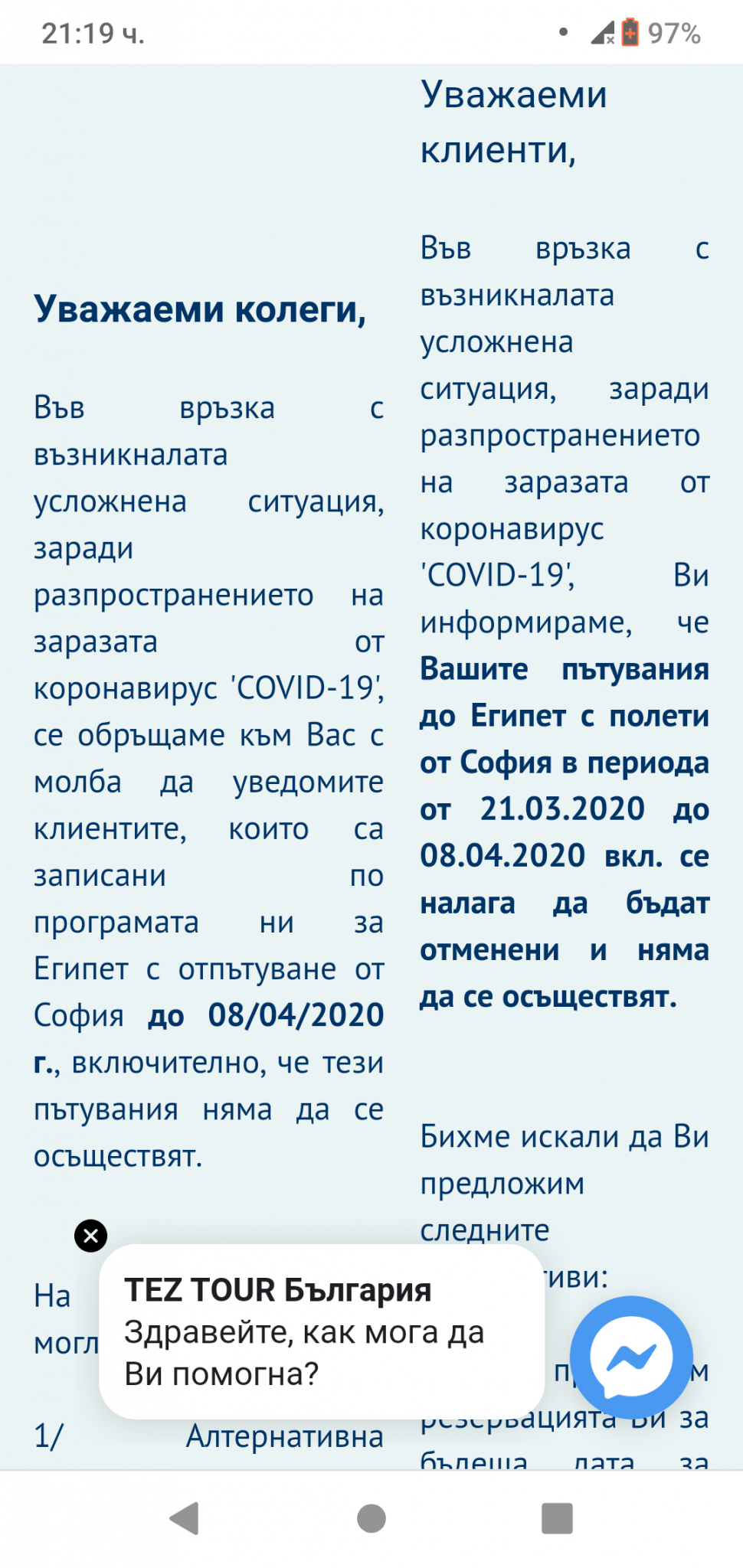 На мен вече ми изпратиха анекс със смяна на датите за октомври, трябваше да заминем на 11.04. И тъй като съм заплатилс цялата сума, ми предложиха да ми възстановят сумата, капарото било достатъчно.