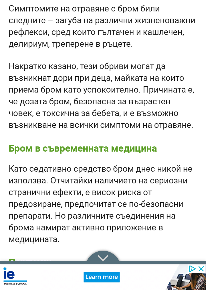 Мъж съм на 18 г. и моят проблем е повишеното до патологична степен либидо, което ми пречи на концентрацията и нормалния начин на живот. От възрастта е най-вероятно, това явно е основната причина. От обща култура и от допълнителна информация от интернет зная, че бромът действа като унищожител на либидото. Както може би и вие знаете или сте чували, на войниците в казармата навремето са слагали бром в чая и са служели спокойно без да бъдат терзани от нагона. И да премина към въпроса - откъде може да се купи бром, под каква форма се продава - течност или хапчета, дава ли се без рецепта, как се употребява и какви могат да бъдат страничните ефекти, ако има вероятност от такива.
