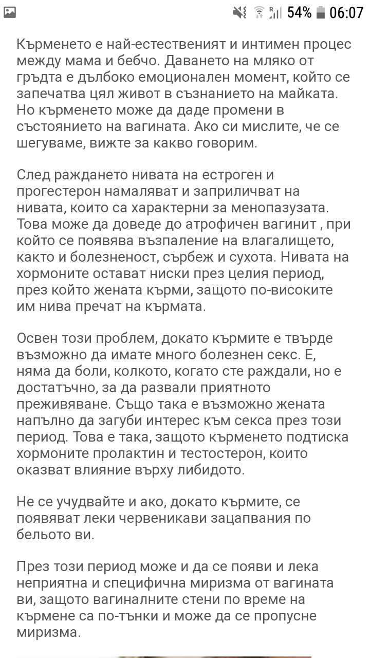 Ох момичета са Ви се оплача и да питам на някой случвало ли му се е. Днес решихме с мъжа ми да правим секс за първи път след секциото. 45 ден е. Но е ужасно болезнено, дори не можа целия да проникне, много ме болеше. Не сме правили секс от не помня и аз кога, май последно някъде в 6,7 месец. Много се притесних, ужасна болка.... Вече с тези болки не знам. Още не съм ходила на гинеколог след раждането, но май вече трябва да посетя. Но наистина ужасно болеше и то дори не проникнат изцяло защото не издържах.