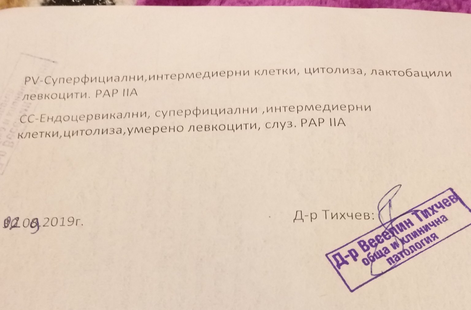 Цитонамазка 3 А, колпоскоп с изменения, Цин 1 потвърден с биопсия. На цитонамазката не ми пишеше никакъв Цин, само че има клетки с дисплазия.