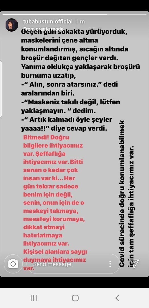 Несмотря на постоянные предупреждения из-за эпидемии Covid 19, которая распространилась по всему миру, тот факт, что некоторые люди не хотят следовать правилам, заставляя нервничать остальных. Почти каждый день, в метро, ​​автобусах и маршрутках продолжают происходить драки из-за людей, которые не носят маску. Знаменитая актриса, в соц. сетях, также поделилась инцидентом в котором оказалась. Как гражданин, так и как женщина с материнской чувствительностью, и о том, как легкомысленные люди навлекают на себя опасность на улице. Бюйюкюстюн обратила внимание на ситуацию, рассказав, что она столкнулась с безответственность, когда молодые люди с масками на подбородке, подходили и распространяли брошюры на улице. Несмотря на то, что она сказала: «На вас нет маски, пожалуйста, не приближайтесь» молодые люди невольно игнорируют эту ситуацию, ответив «Ничего такого больше нет» Туба Бюйюкюстюн привела пример, ситуации, с которой она столкнулась лицом к лицу. Подчеркнув, что в обществе существует мнение, что эпидемия Covid 19 закончилась. Но случаи заболевания продолжают распространяться, люди умирают, это влияет на весь мир, по психологическим, социальным, физическим, экономическим вопросам. Актриса обратила внимание на масштабы этой проблемы и призвала людей соблюдать дистанцию ​​и не заходить в личные пространства. В своем сообщении Туба Бюйюкюстюн обратила внимание на важность получения точной информации и прозрачности, и подчеркнула, что существует отсутствие информации в этом направлении, когда люди ведут себя так, как будто все улучшилось.