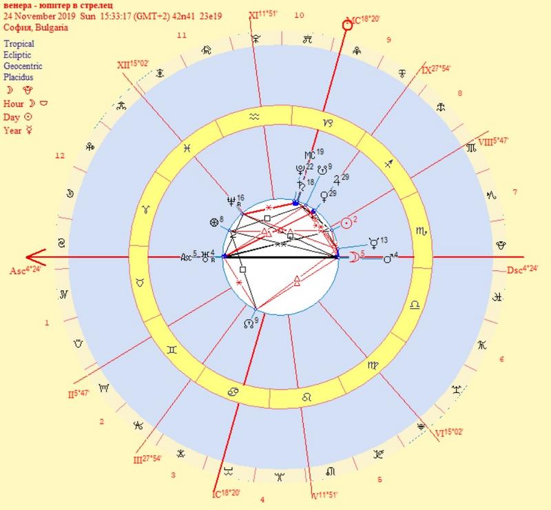 На хората ни се иска да се случват и затова имаме нужда да вярваме в приказки, чудеса. Дори и те да са илюзия. Едно от основните неща в астрологията е човек да има потенциал за нещо. Метафорично казано да има подходяща почва и условия, за да хване дикиш. Добре поставени Венера и Юпитер. За да намери буквално щастие и успех, шанс, просперитет в и чрез взаимоотношения, взаимодействие със средата и условията, в които е поставен. Средата, в която се намира да е благосклонна към неговите желания, способности и таланти. Като им дава рамо, шанс. Да е на тази вълна по някакъв начин. В случая обмен Венера - Юпитер. Пред тези, които имат такъв, моментът от времето, в който Венера и Юпитер са в точен съвпад, поставя само началото на период, в който всички тези неща ще се случват през призмата на зодиакалния знак Стрелец. Стрелецът е олицетворение на шанс посредством разширяване на хоризонта, гледната точка, обогатяване на светогледа, на неща с мащаб, перспектива. Контакт и взаимоотношения с хора, които го предполагат - образовани, ерудирани, с по-мащабно виждане и филофски възгледи за нещата, чужденци, хора от различни религии и етнос.