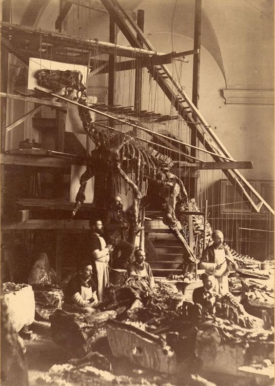 Сглобяване на скелет на игуанодон в St. George Chapel, Брюксел, 1882 г.  Заради размерите на такива скелети е било необходимо високо помещение. Решението е било да се избере тази църква, където колекцията е и до днес.