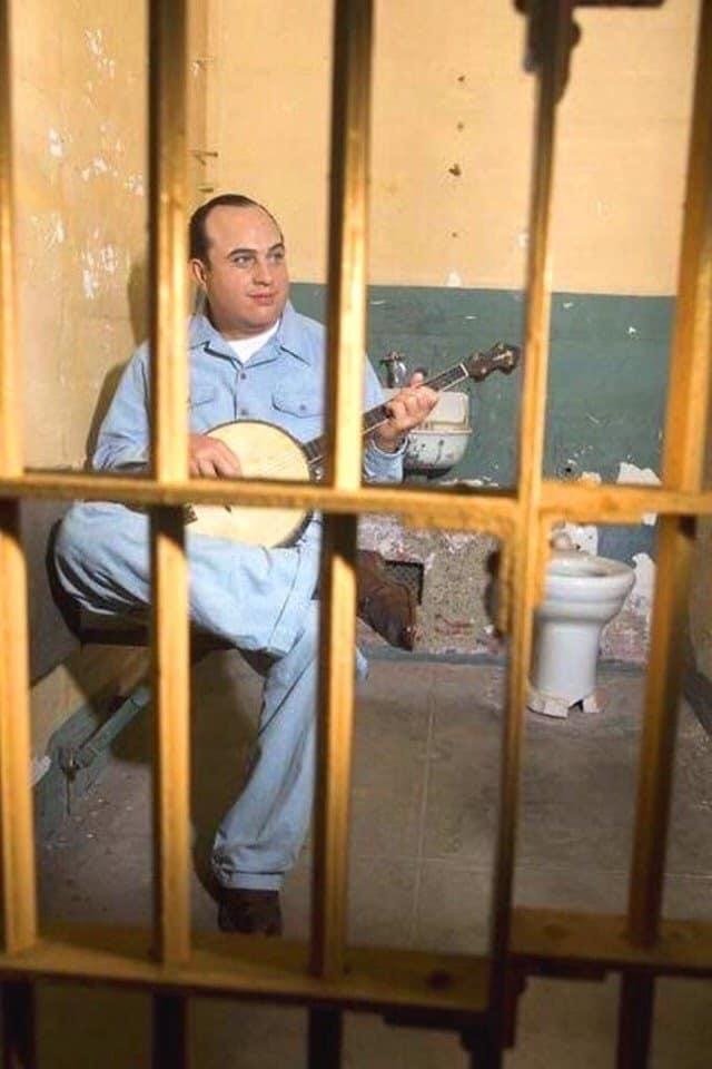 Рядка цветна снимка на Ал Капоне, свири на банджо в затвора (1930-те години)