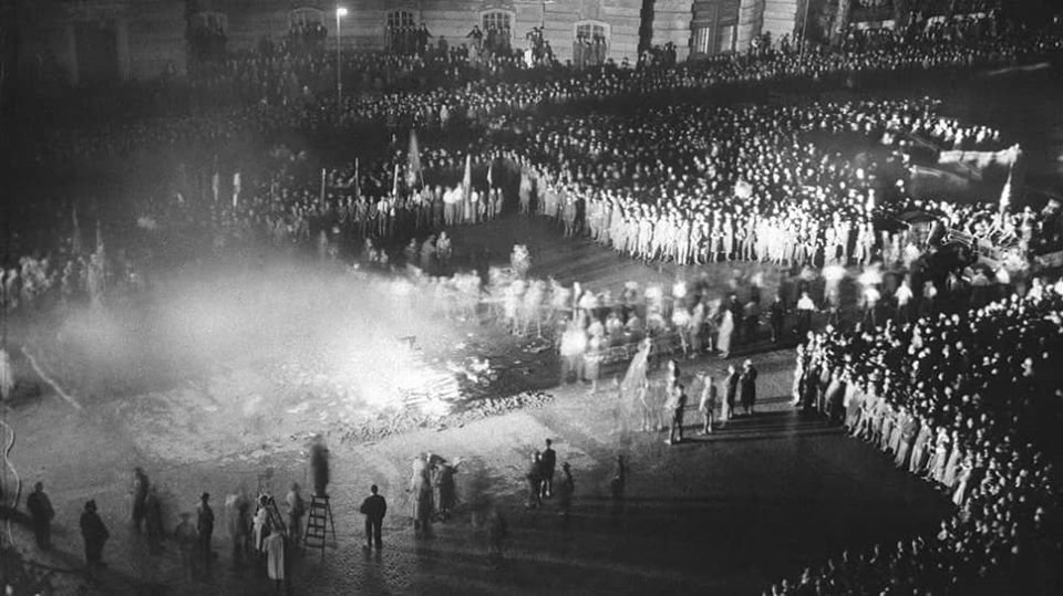 10 май 1933 г. Берлин. Площад " Опернплац*.  Аутодафе на творбите, които не са свързани с националсоциалистическата идея. По време на акцията в 22 града в Германия са унищожени няколко хиляди книги на автори - евреи, комунисти и пацифисти. Книгите на Ерик Мария Ремарк са горени също.