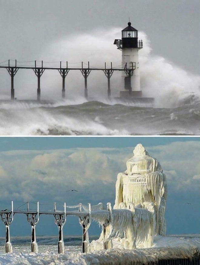 Фар в Мичиган преди и след голяма ледена буря:
