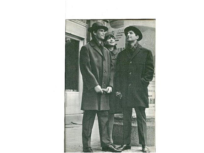 А тук заедно със Стефан Данаилов в ролята му на манекен през 1965 г, той показва светлокафяв балтон от флаконе.
