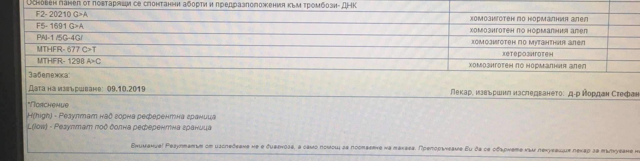 Имаш една хомозиготна и две хетерозиготни мутации по нискорискови фактори. Добре е да си на антикоагулантна терапия при бременност.