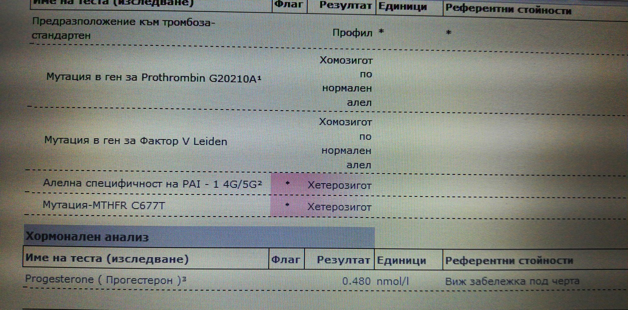 Момичета здравейте, пиша за първи път в тази тема. Предстои ми ЗЕТ, доктора ми пусна за всеки случай изследвания за тромбофилия. 4 фактора са изследвани, за първите 2 разбирам, че са в норма, но вторите 2 оцветени в червено не са ми ясни. Имам ли я тази тромбофилия или не, моля за помощ и благодаря предварително Simple Smile