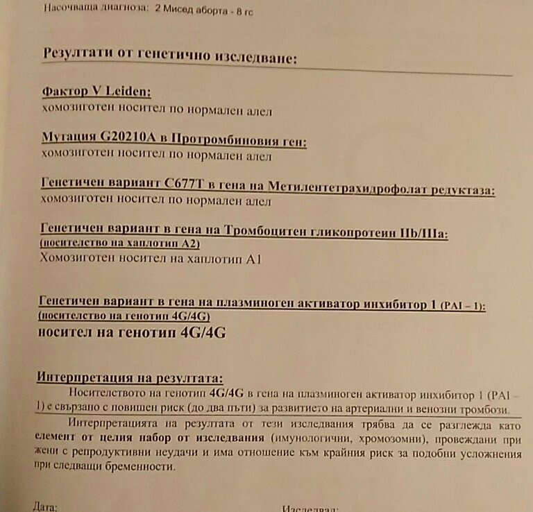 Сега съм бременна в 12г.с. на 31год. , но понеже забременяването беше по-трудно от обикновено (6мес.) реших да посещавам репродуктивен специалист. Не ми е предписвала друго освен фолиева киселина и дуфастон(с редовен цикъл съм). Според мен факта, че повечето пациентки на следящото АГ имат проблеми, ми назначава допълнителни изследвания и терапии. Като забременях фолиевата и дуфастона останаха, но включи и Натаспин - без обяснение. На два от прегледите имах кръвно 125/85 , прати ме на кардиолог в същата клиника , който ми изписа Изоптин. Вкъщи такова кръвно никога не съм мерила, от тогава редовно го следя и не съм вдигала, но ми оставиха хапчетата. Вчера на БХС - всички рискове са в норма , вкл. и прееклампсия, кръвотока и т.н. Днес ми излязоха резултати за тромбофилия - хетерозиготен на MTHFR 1298 A>C и  PAI-1 (4G/5G). На няколко пъти АГ ми намекна, че по натам сигурно ще включваме Фракси, но сега явно това ще й е повода. Доколкото разбрах , а и коментара под изследванията, ще пусна допълнителни за нивата на витамините, следене на кръвното, кръвотока и изоставане. Мисля да запиша час за Паскалева, но предпогам , че ще е след няколко седмици. Не ми се сменя сега АГ , но за мен това е презастраховане. Моля и за вашето мнение.