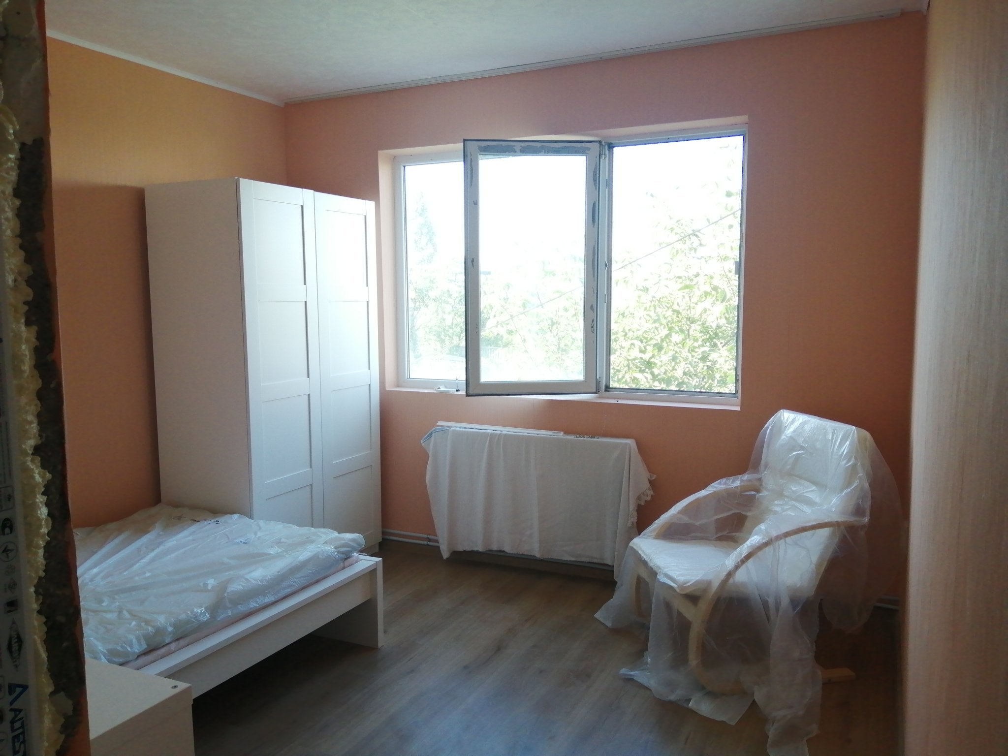 Независимо от това бих променила разположението, не пречи те да бъдат там - кухнята към стената, масичката пред парното. В момента ми изглежда много сбутано, затварящо, доколкото виждам и прозорецът с отваряемата част е с крилото към бъдещото бюро. Това не е практично, ще пречи. При отваряне на вратата на гардероба, както е в момента, тя ще се удря в рамката на кревата или радиатора. Тази, която е откъм радиатора не се отваря докрай.