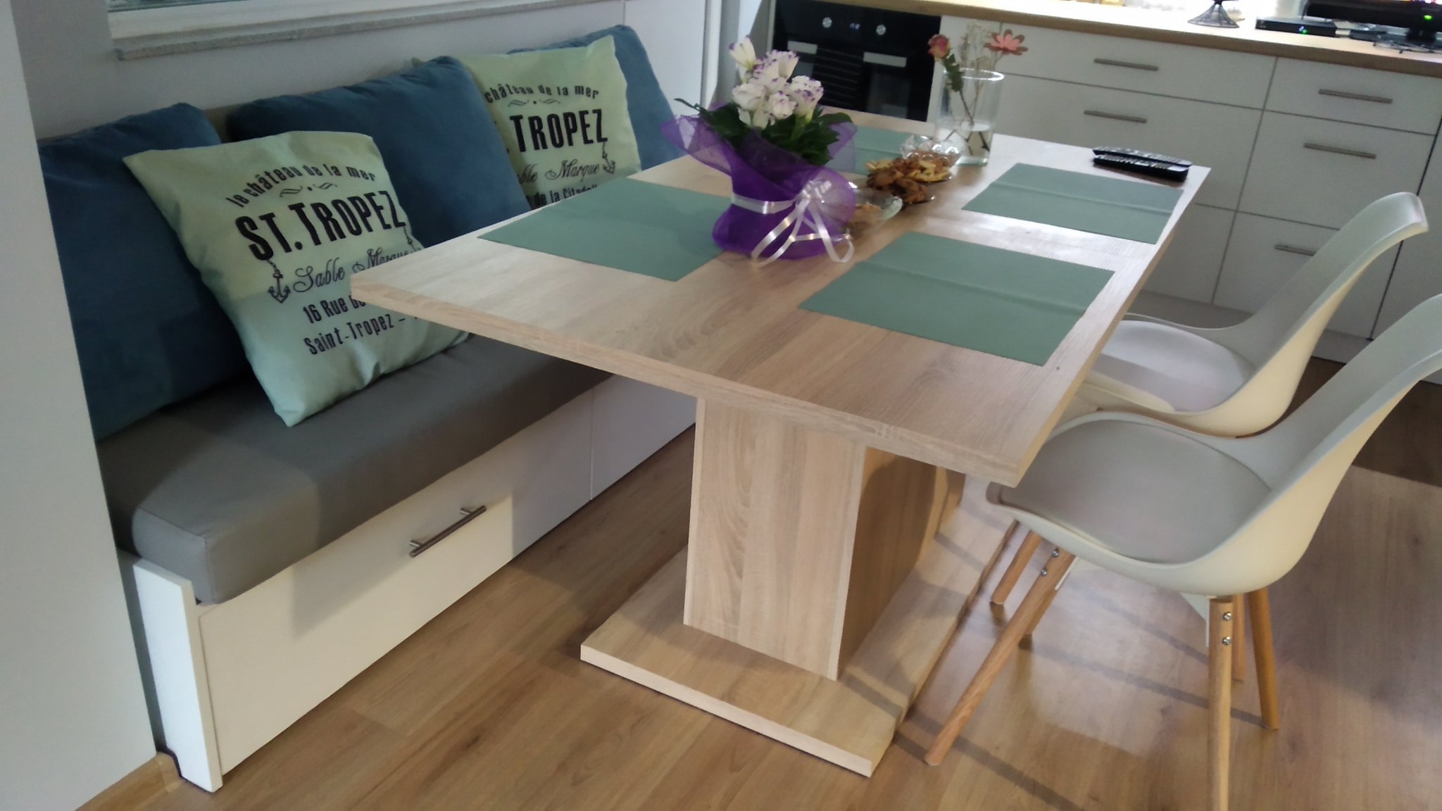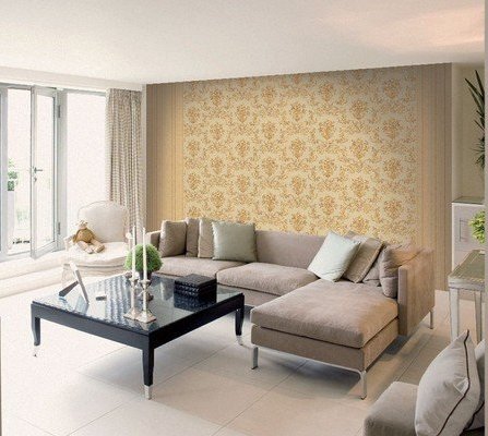 Какъв цвят на стените би бил подходящ за стая с подови настилки в тон с тапетите и кухня в бяло?