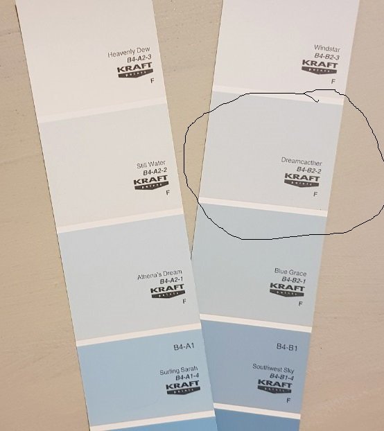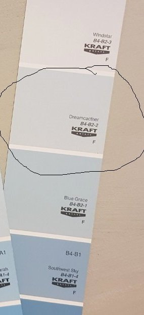 Бебешко синьо с мнооого лек сив подтон. Обаче объркаха ли нещо в дозата, не знам, но се получи доста по-наситен цвят от избрания. Няма грешка, защото на капака беше записан правилният код, но като намазахме първата ръка на стената стоеше доста по-наситено. Докупих бяла и разредихме, докато догодихме наситеността която бях избрала. В банята се получи абсолютно същият проблем и според мен машината/компютъра им пуска малко повече цвят. Така че на практика мога да ти покажа кое съм избрала и като нюанс е точно това, само дето е малко по-наситено на стената в момента от ограденото на картончето.