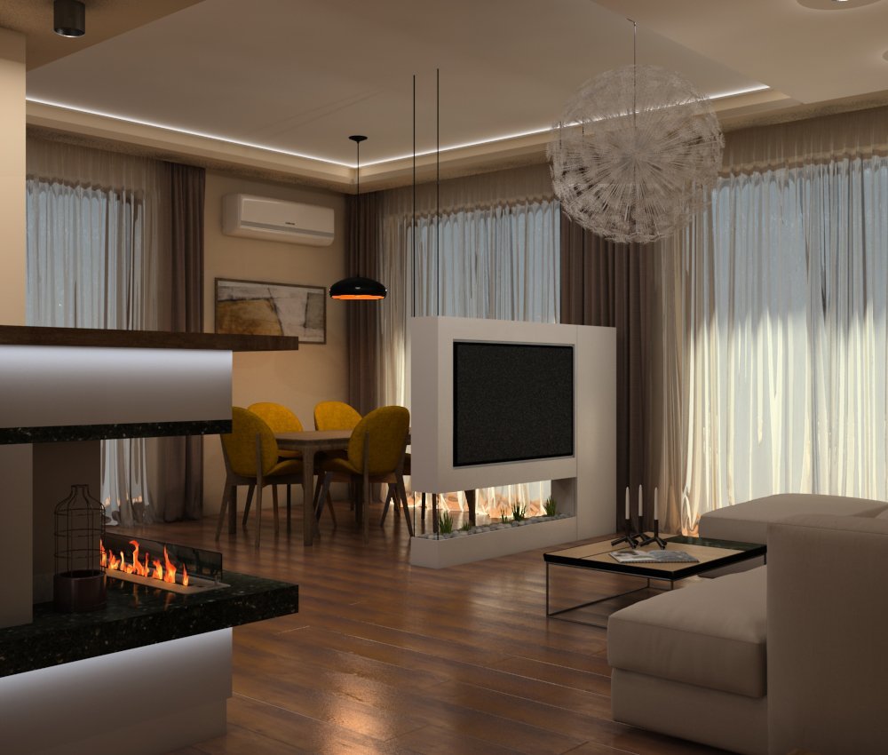 Другото което  е,между дивана и масата за хранене,там дето съм ти нарисувала тв-то,може да сложи стойка който се върти на 180 градуса,а може и преградно пано с два телевизора,голям откъм дивана и един мъничък към трапезарията(виждала съм го като изпълнение,много добре се беше получило)