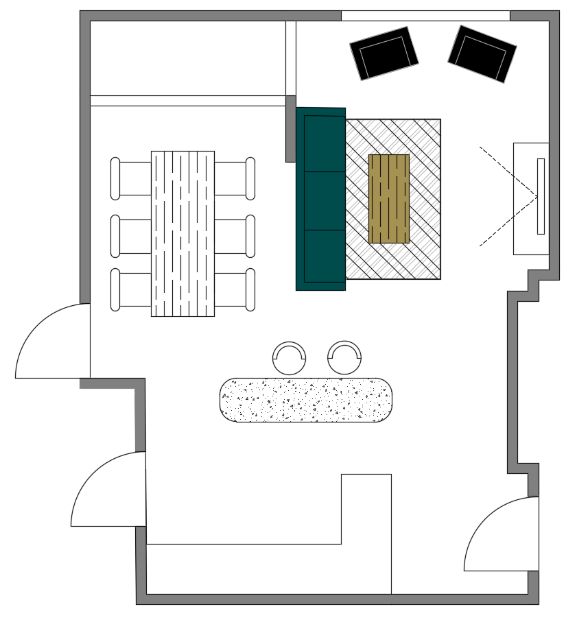 Много хубава идея, но аз не бих сложила барплот(струва ми се малко пространството за него) и бих заложила на 2 дивана или 1 ъглов.