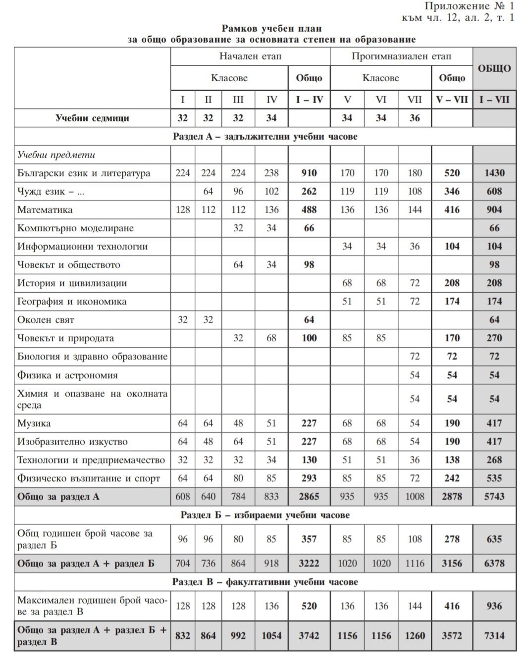 Ако не ви се дели: БЕЛ - 5 часа седмично, ЧЕ - 3 часа седмично, МАТ - 4 часа седмично, ИТ - 1 час седмично, История - 2 часа седмично, География - 2 часа седмично, Биология  - 2 часа седмично, Физика - 1,5 часа седмично, Химия  - 1,5 часа седмично, Музика  - 1,5 часа седмично, Рисуване  - 1,5 часа седмично, ТП  - 1 час седмично, ФВС  - 2 часа седмично. Предметите ИУЧ са общо 3 часа седмично, а тези ФУЧ (които не са задължителни) са 4 часа седмично.