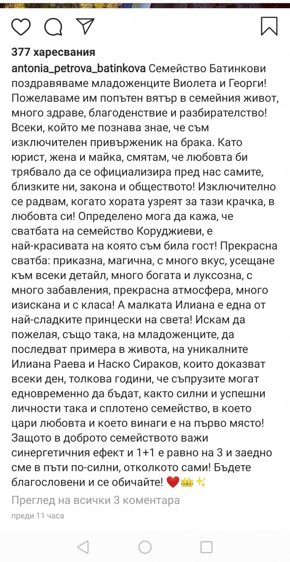 Мен ме кефи и посланието на семейство Батинкови. Неграмотно, стилистичен бълвоч, но пък с нотка самоирония "всеки, който ме познава знае, че съм изключителен привърженик на брака" - това обяснява 18738те й сватби.