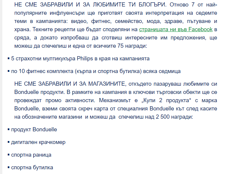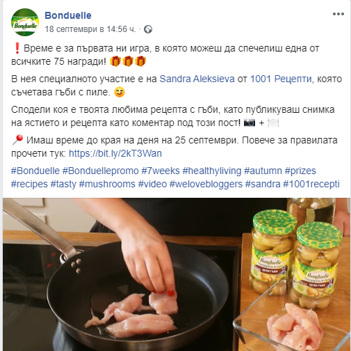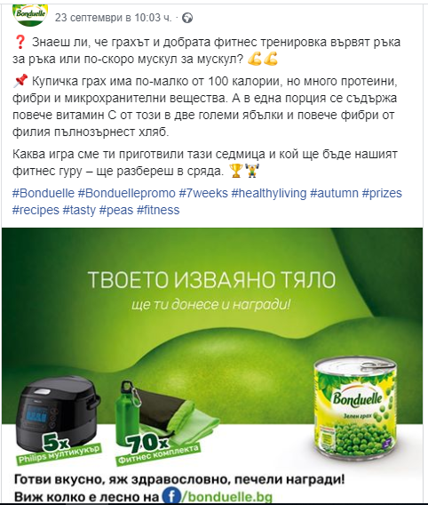 Игра на  Bonduelle https://www.facebook.com/bonduelle.bg/ Като може и с касова бележка ,отделно да се участва за други награди.https://bonduelle.bg/statiya/gotvi-vkusno-yazh-zdravoslovno-pecheli-nagradi