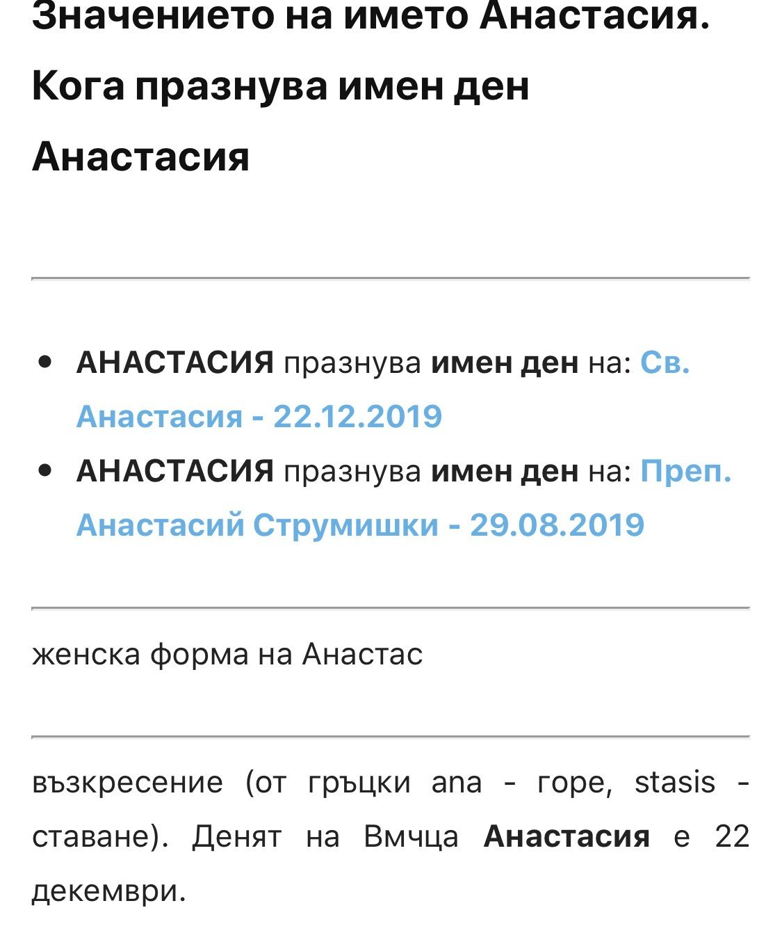 Анастасия е с гръцки произход,а това,че се използва в Русия,изобщо не го прави руско име.